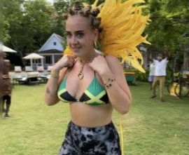 Adele had social media buzzing in a tribute to the Notting Hill Caribbean Carnival in a Jamaican flag bikini top in an Instagram post. The 32-year-old English singer-songwriter had her hair in Bantu knots, a yellow feather headdress, and black & grey leggings.